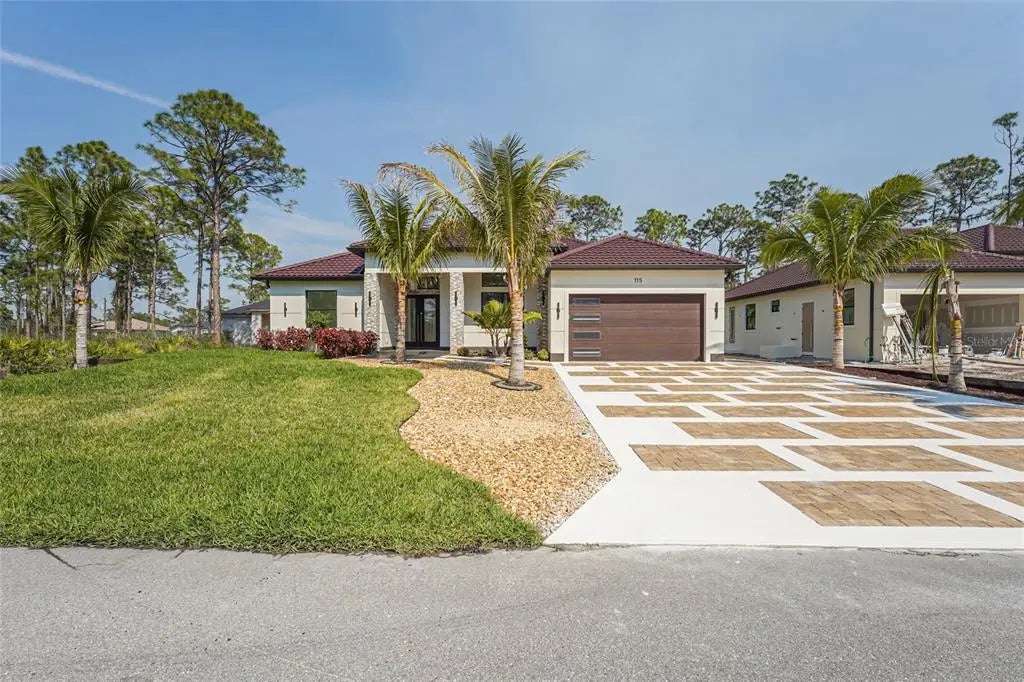 Welcome to 115 Solana, a brand-new CUSTOM-BUILT home that seamlessly blends contemporary elegance with high-end craftsmanship. This stunning residence is just 3.5 miles from Wellen Park and the Atlanta Braves Training Stadium, offering an unparalleled lifestyle in a prime location. From the moment you arrive, the striking curb appeal captivates with a concrete driveway accented with paver bricks, lush landscaping, and a welcoming open front porch leading to the grand double-door entrance.