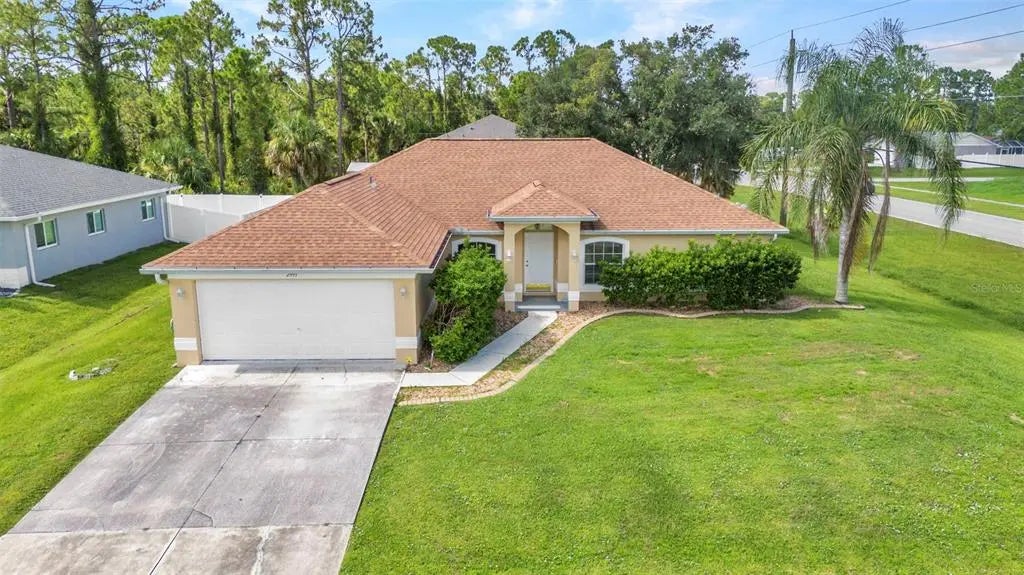 Welcome to this well-maintained 3-bedroom, 2-bathroom, 2-car garage home offering 1,858 sq ft of living space on an oversized corner lot with the convenience of city water. Step inside to find a formal dining room and a versatile bonus room perfect for a home office, den, or playroom. The home features vaulted ceilings and easy-care linoleum flooring throughout. The kitchen is a chef’s delight, complete with a breakfast bar, pantry closet, and ample cabinet and counter space to meet all your culinary needs. A cozy breakfast nook just off the kitchen offers the perfect spot to enjoy your morning coffee. The spacious primary suite boasts his and hers walk-in closets and an en-suite bathroom featuring new linoleum flooring, dual sinks, a shower/tub combo, and a linen closet for extra storage. Both guest bedrooms include ceiling fans and built-in closets and new linoleum flooring. The guest bathroom offering a single vanity and shower/tub combo and new flooring. Additional features include an inside laundry room complete with washer and dryer, and a spacious garage for storage or hobbies. Updates include Interior and Exterior paint 2025 and Roof 2022. No HOA or deed restrictions!! Conveniently located close to I 75, restaurants, shopping, beaches, and more. Ask to see this one first...make YOUR appointment today!!!