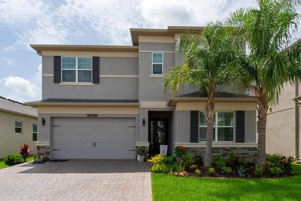 Crisp modern finishes, open-concept living, and outdoor entertaining dreams come together in this stunning 4-bedroom, 3-bathroom home in Wesley Chapel’s sought-after Winding Ridge community. Built in 2021, this spacious 2,591 sq ft residence offers the perfect blend of functionality and style, all set on a beautifully landscaped lot with no rear neighbors for added privacy. The elegant brick paver driveway leads to a 2-car garage and sets the tone for the quality throughout. Inside, the first floor features sleek ceramic tile flooring and a flowing layout designed for modern living. The gourmet kitchen is a standout with its oversized island, gleaming quartz countertops, abundance of cabinetry, decorative tile backsplash, and stainless-steel appliances—including a gas stove. A separate dining area connects seamlessly to the expansive family room, where 4-panel sliding glass doors open to a screened-in outdoor retreat. Downstairs also includes a well-appointed guest bedroom with a walk-in closet and adjacent full bathroom with a shower—ideal for multigenerational living or visiting guests. Upstairs, you'll find wood stairs with iron railings leading to a bright and airy bonus loft. The entire second floor features stylish laminate flooring that ties into the stair finish for a cohesive feel. The luxurious primary suite boasts two walk-in closets and a spacious en suite with dual vanities and a large walk-in shower. Two additional bedrooms—one with its own walk-in closet—share a full bath with a shower/tub combo. The laundry room is conveniently located upstairs as well. Step outside to a backyard built for entertaining, featuring a large screened-in lanai with brick pavers, a custom outdoor kitchen with a grill, fry station, sink, and refrigerator, plus a luxurious hot tub. A privacy hedge along the rear adds a peaceful, secluded feel. With high-end finishes, a smart layout, and an unbeatable location in a resort-style community, this home checks every box for comfort and convenience in one of Wesley Chapel’s premier neighborhoods.