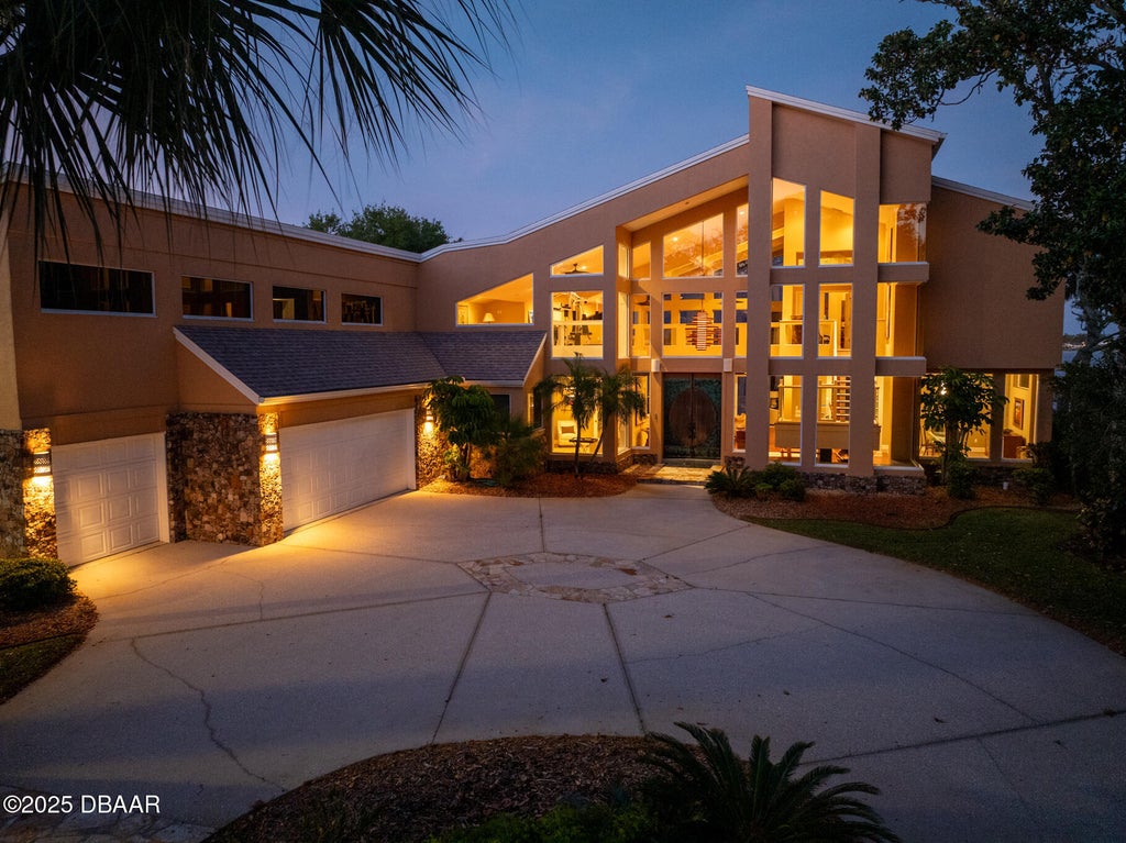 Direct riverfront contemporary estate home like no other offered here on beloved Oak Forest Drive. The stunning, one-of-a-kind architectural design was created to allow for spectacular views from nearly every angle of the open, airy living spaces situated beneath 30' ceilings. With over 7400 sq ft of custom construction, the home features open living areas that are only defined by subtle architectural details. Ideal for entertaining or casual, luxury living the interior was professionally redesigned and subsequently reconstructed by the highly regarded general contractors at Coleman, Goodemote Construction. The spectacular finished product presented here must be seen in person to be truly appreciated. Step inside to immediately be greeted by panoramic water views through large window panels symmetrically arranged to create a wall of glass along the waterfront. MORE... Morning sun is welcomed into the main living areas where a catwalk stretches above connecting a sprawling loft to the second story primary suite. The riverfront kitchen and accompanying casual dining and sitting areas were designed to function as an area for entertaining while cooking with two grand kitchen islands, an additional service bar and several prep stations beneath handsome, solid wood cabinetry complimented by beautiful granite tops and top of the line appliances. The adjacent gracious formal dining room is tucked beneath the lovely floating staircase with floor to ceiling windows overlooking the ancient oak trees that shade the front yard. Double doors off the main living room give way to a private den that could serve as an executive office or 4th bedroom. The home was designed with a separate waterfront entertainment and living space dedicated to guests but could be the ideal children's wing for a family. This unique ground floor waterfront living area can easily be opened to the main living room or just as easily closed off with plenty of space for the pool table, wet bar, wine bar and coffee bar...all opening onto the grand waterfront lanai. Just beyond you will find two private and spacious guest suites with vaulted ceilings across the hall from the downstairs utility and laundry room. Upstairs, the owners' quarters with private balcony features unobstructed water views with private sitting room, luxurious bath, cavernous closet/dressing room and dedicated laundry. The fabulous, covered lanai spans the entire length of the home beneath tall ceilings and serves as the owners' open-air waterfront living and dining room. Courtyard entry, oversized three car garage. Just 3.8 miles to the beach, Oak Forest Drive is a quiet oak covered lane where waterfront homes are arranged along the westerly bank of The Intracoastal Waterway at the foot of the vast Tomoka State Park and the scenic highway known as The Loop. This property is a true standout in today's waterfront market and has been priced at a fraction of replacement cost.