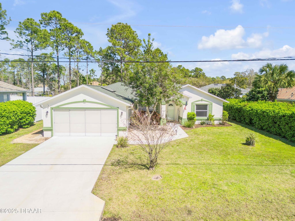 Welcome to this charming 3-bedroom, 2-bathroom single-family home in beautiful Palm Coast, Florida. NEW AC 2024. With 1,540 square feet of living space, this home offers a spacious and inviting layout that is perfect for both everyday living and entertaining. Upon entering, you'll be captivated by the soaring vaulted ceilings and the open flow that seamlessly connects the living room, dining room, and kitchen. The kitchen is a chef's dream, featuring solid countertops, ample cabinet space, a convenient breakfast bar, and sleek stainless steel appliances. Just off the kitchen, you'll find the formal dining room, ideal for hosting family gatherings or special occasions. The primary bedroom is a peaceful retreat, complete with tray ceilings and an en suite bathroom that offers dual sinks, a walk-in shower, and a large walk-in closet. The two additional bedrooms are located on the opposite side of the home, providing a split-bedroom layout for added privacy. The true highlight of this home is the outdoor oasis, which boasts a spacious, screened-in lanai perfect for relaxing or entertaining. The inground pool is the centerpiece of the private, fenced-in backyard, offering plenty of room for outdoor activities. Additionally, the pool house adds extra convenience and functionality to this fantastic outdoor space. This Palm Coast home is a true gemdon't miss the opportunity to make it yours! Mortgage savings may be available for buyers of this listing.
