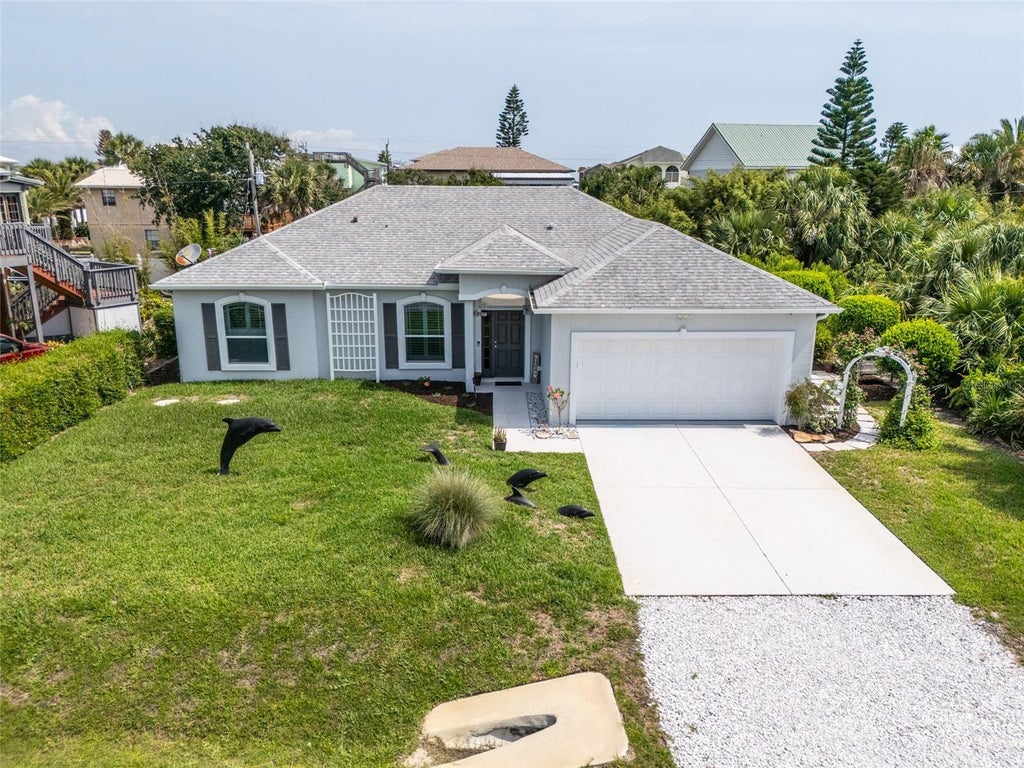 One or more photo(s) has been virtually staged. Direct access from your doorstep to the beautiful Marineland Acre beaches. This solid concrete foamed ranch is very energy-efficient and built by Florida Green. Home is built on a high-and-dry lot. Featuring three bedroom, two bath open flow floor plan with marble flooring. Enjoy the serene backyard from the four season room. The lush landscaping offers exceptional privacy—your perfect coastal retreat. No restrictions on rentals