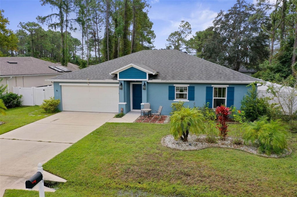 Built in 2020, this modern 3-bedroom, 2-bathroom home in the Belle Terre community of Palm Coast offers 1,500 square feet of stylish living with thoughtful upgrades throughout. The open floor plan is enhanced by high vaulted ceilings and laminate flooring, creating a bright and inviting atmosphere. The kitchen is beautifully designed with quartz countertops, stainless steel appliances, and plenty of cabinet space, opening seamlessly to the dining room and spacious living room. Sliding glass doors extend the living space to a large covered and screened-in lanai, perfect for relaxing or entertaining year-round. This split-bedroom floor plan ensures privacy, with the primary suite featuring a walk-in closet, dual sinks, and a modern walk-in shower. The oversized backyard is perfect for outdoor living, complete with a shed, firepit, and plenty of space to design your dream retreat or even add a pool. Located just 3 minutes from Wadsworth Elementary School and the Palm Coast Aquatics Center, this home is also close to shopping, dining, and recreational trails. Plus, Flagler Beach is less than 20 minutes away, offering quick access to sandy shores and coastal activities. Don’t miss your opportunity to own this beautifully maintained Palm Coast home in Belle Terre—schedule your private showing at 57 Palmwood Dr today!
