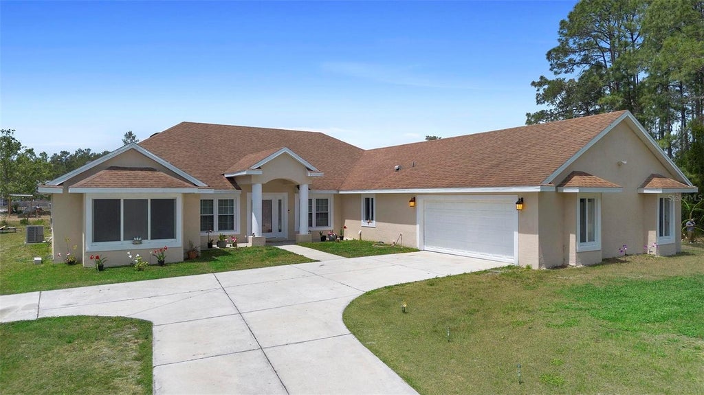 Welcome to this stunning estate in the highly sought-after Deltona Ranchettes, offering the perfect blend of space, style, and functionality! This sprawling 4-bedroom, 4-bathroom home boasts over 4,300 sq. ft. of living space and is ideal for those seeking luxury and comfort on a grand scale. Built with quality and thoughtfully designed, the home features multiple living areas, a finished garage (602 sq. ft.), 395 sq. ft. of patio space, and an open finished porch, totaling over 5,300 sq. ft. under roof.